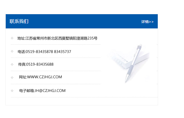 傳真:0519-83435688    郵編:213135    網址:WWW.czjhgj_com.kyk167.com    電子郵箱:JH@czjhgj_com.kyk167.com